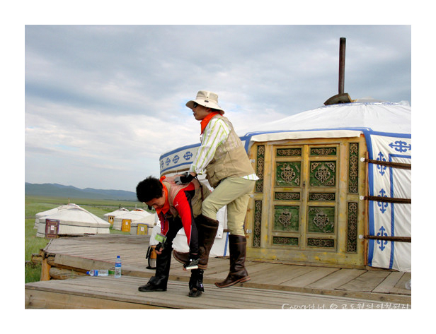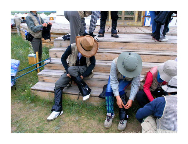 말타기에 앞서 모두들 안장으로부터 다리를 보호해 줄 각반을 착용하고 있다.