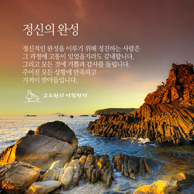 태그로 보는 아침편지 유튜브 명상 #다짐 #계획 #바이러스 #힐링 #아이들 비전캠프 독서캠프 #삶 #경험 #사람 #도움 #선택 희망 나눔 #친구 링컨학교 #극복 리더 위기 #독서 건강 면역력 정신의 완성 정신적인 완성에일생을 바친 사람은 그가원하는 것이 항상 그의 손안에... #감사 #기쁨 #과정 #만족 #고통 #상황 #정진 #감내 #정신적완성 느낌한마디 28 좋아요 6 모으기 3 2025.12.22. 월요일 두려울 게 없다 내가 대책 없이집을 정리하고 세계를 떠돌기로 한 것은내가 지키고 싶어도 지킬 수 없는 게 있다는... #용기 #선택 #여행 #세계 #결과 #배낭 #상황 #자포자기 #기로 #절망적 느낌한마디 14 좋아요 5 모으기 5 2025.10.23. 목요일 당신들의 지혜는 어디로 사라졌나? 수 세기에 걸쳐미국에서 살아오며 우리는눈앞에 창창한 내일이 기다릴 것이라고... #지혜 #기회 #현실 #위기 #부족 #필요 #눈 #상황 #쓰나미 #집단 느낌한마디 28 좋아요 7 모으기 1 2025.5.20. 화요일 내면의 평온함을 유지하는 방법 이 모든 것의 최종 목표는단 하나, 바로 내면의 평온함을 찾는 것이다.인생에서 어떤 일을 경험하든, 무슨 일이 벌어지든,... #명상 #삶 #내면 #바람 #깨달음 #핵심 #파도 #유지 #상황 #평온함 느낌한마디 19 좋아요 12 모으기 16 2024.6.25. 화요일 오뚝이처럼 사람과사람 사이의 믿음은우리를 지탱하는 보이지 않는... #출발 #믿음 #사람 #중심 #약속 #사이 #상황 #오뚝이 #신의 #초토화 느낌한마디 30 좋아요 12 모으기 9 2024.6.11. 화요일 단 하나의 차이 달, 날. 겨우 한 획 차이지만 30배의 차이를 가지고 있습니다.우리는 가끔 잊고 살지만 하나의 변화와 하나의 공백 ... #변화 #삶 #생각 #사람 #노력 #우리 #요구 #상황 느낌한마디 21 좋아요 12 모으기 10 2023.2.18. 토요일 '어떻게' 살아갈 것인가? 밥을 먹고 무얼 하는지를 보면 그 사람이 어떤 사람인지 알 수 있다. ... #사람 #조건 #일 #직업 #숙제 #상황 #수단 #밥벌이 느낌한마디 31 좋아요 53 모으기 38 2020.4.14. 화요일 자기 암시 행복이나 불행은어떻게 상상하느냐에 달려 있다. 이를테면 똑같은 상황에 처해 있는... #행복 #불행 #디딤돌 #암시 #상황 느낌한마디 149 좋아요 0 모으기 0 2012.4.6. 금요일 1