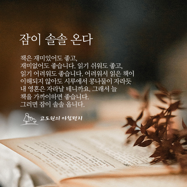 태그로 보는 아침편지 유튜브 명상 #다짐 #계획 #바이러스 #힐링 #아이들 비전캠프 독서캠프 #삶 #경험 #사람 #도움 #선택 희망 나눔 #친구 링컨학교 #극복 리더 위기 #독서 건강 면역력 잠이 솔솔 온다 독서가 취미라고 하면밥맛이라고 할지 모르겠는데,재미있는 책도 많다는 점, 잠이... #이해 #영혼 #책 #잠 #가까이 #재미 #늘 #콩나물 #시루 #솔솔 느낌한마디 21 좋아요 4 모으기 0 2025.10.27. 월요일 돌아가신 아빠의 여권을 들고 그럼에도, 이렇게 매일 바닥을 치는 마음 중에도, 가슴 떨리게 가고 싶은 곳이, 가야 하는 곳이... #감사 #영혼 #사랑 #동행 #마음 #사람 #길 #대화 #함께 #가지못한길 느낌한마디 20 좋아요 7 모으기 1 2025.9.25. 목요일 우는 얼굴을 보면 슬픔의 깊이를 알 수 있다 목적지인 '철의 십자가'에도착했을 때, 언젠가부터 나와 앞서거니뒤서거니 걷던 독일 여자가 보였다. 십자가에... #슬픔 #영혼 #눈물 #우물 #은총 #신 #마중물 #재단 #상흔 #논밭 느낌한마디 16 좋아요 5 모으기 2 2025.9.24. 수요일 글이 안 써지면 여행을 떠난다 한 가지는 확실했다.써질 때 써야 했다. 문제는이런 경험이 내가 원하는 만큼 자주... #영혼 #경험 #예술가 #영감 #동조 #작품 #익숙 #작가 #메시지 #충동 느낌한마디 20 좋아요 9 모으기 3 2025.9.10. 수요일 '나도 한번 글을 써보겠다' 글쓰기는 달리기와 같다.달리기는 언제든 마음만 먹으면 할 수 있다.다만 결심이 먼저 서야 한다. 건강을 위해서든,... #영혼 #마음 #준비 #지금 #글 #응원 #몽당연필 #쓰기 #시점 #독자 느낌한마디 24 좋아요 8 모으기 4 2025.8.6. 수요일 신경과민일 때는... 신경과민은지적 노동의 해악과 같은결과물이 아니다. 자연의 선물이다.... #영혼 #몸 #중요 #신호 #화 #짜증 #집착 #메시지 #두통 #신경과민 느낌한마디 19 좋아요 3 모으기 3 2025.7.9. 수요일 자신을 깊숙이 만나는 시간 외로움은모든 인간이 느끼는 감정입니다.부정적인 감정이 아니라 감내해야 하는... #외로움 #영혼 #성숙 #시간 #내면 #인간 #방법 #덕목 #신앙 #깊이 느낌한마디 23 좋아요 7 모으기 4 2025.6.27. 금요일 몸이 내 맘대로 안 움직인다 나는내 몸과 친하지 않다.몸은 내가 원하는 상황에서... #영혼 #마음 #생각 #조화 #몸 #시스템 #자율신경계 #면역계 #내분비계 #순환계 느낌한마디 22 좋아요 5 모으기 2 2025.6.16. 월요일 영혼을 울리는 노래 '음악교육을 받아 본 적이 없는 친구들이 어떻게 저런 영혼을 울리는 노래를 할 수 있을까?'... #영혼 #언어 #엄마 #노래 #음악 #눈 #멜로디 #태초 #아기 #옹알이 느낌한마디 19 좋아요 7 모으기 3 2025.5.7. 수요일 끝까지 함께 하는 사람 세상도 사람도실수와 실패를 반복하면서 성장한다.그렇지만, 실수와 실패의 기억이 쌓여 망설이고... #영혼 #친구 #재능 #사람 #그대로 #소울메이트 #성격 #조력자 #지지 #개조 느낌한마디 22 좋아요 11 모으기 10 2025.4.16. 수요일 건강도 실력이다 우리의 삶은기나긴 시간의 연속이다.당장은 손해인 듯 보이는 운동이... #영혼 #건강 #집 #운동 #몸 #중요 #이유 #수면 #섭생 #머무를곳 느낌한마디 26 좋아요 8 모으기 7 2025.4.11. 금요일 혼자 떠드는 이야기 그동안 쌓아온자신만의 이력과 그 과정에서직접 부딪치며 깨달은 것들이 있을 것이다.... #영혼 #사랑 #혼자 #공감 #건강 #사람 #교만 #타인 #반감 #절제력 느낌한마디 30 좋아요 7 모으기 4 2025.3.27. 목요일 내 영혼이 지칠 때 영혼 노동자는자신의 영혼에 지적 영양분을 공급해주어야 한다. 지난 수년간 나는 부박한 내 영혼을... #영혼 #삶 #고갈 #밥 #고립 #숨 #메시지 #지적영양분 느낌한마디 18 좋아요 7 모으기 3 2025.3.17. 월요일 영혼이 폭삭 늙는 기분 같이 있기 피곤한떼쟁이 연인이나 친구를슬금슬금 피하고 싶은 건 당연한 심리입니다.... #영혼 #마음 #동반자 #몸 #나 #정신 #원인 #재미 #피곤 #피폐 느낌한마디 16 좋아요 7 모으기 2 2025.2.14. 금요일 임종을 목격한 사람 호스피스 간호사로 일하거나누군가의 임종을 목격한 사람이라면누구나 예외 없이 경험해 봤을 것이다.... #영혼 #느낌 #기억 #아버지 #감정 #평안 #임종 #육신 #목격 #필연적 느낌한마디 20 좋아요 7 모으기 4 2024.12.12. 목요일 영원한 연인 연인이란단 한 사람에게만허락할 수 있는 자리이기에... #영혼 #사랑 #인내 #삶 #마음 #동반자 #연인 #성장 #소울메이트 #영원 느낌한마디 17 좋아요 12 모으기 8 2024.11.28. 목요일 '왜 하필 나야?' 몇 년이 지난 지금도여전히 엘리자베스를 기억한다.엘리자베스는 그토록 젊은 나이에 홀로... #감사 #영혼 #성숙 #삶 #사람 #진정 #불행 #모든것 #위대한영혼 #왜하필나야 느낌한마디 19 좋아요 9 모으기 8 2024.11.21. 목요일 전쟁터의 샘물에서 전쟁터에 자리한이곳의 샘물은 우리들에게생명을 더욱 북돋아 주는 참 샘물이었다.... #영혼 #기도 #희생 #산티아고 #순례 #명상치유여행 #손문규 #베트남전 #참전기 #전쟁터 느낌한마디 37 좋아요 5 모으기 1 2024.11.12. 화요일 돈은 '힘'이다? 돈이라면세상 모든 게 가능하다고말하는 시대다. 돈이 있으면 그른 것이... #영혼 #힘 #에너지 #사람 #몸 #세상 #돈 #천국 #지옥 #사용 느낌한마디 18 좋아요 6 모으기 3 2024.11.7. 목요일 내가 나를 의심하면 데카르트는 말한다."내가 내 영혼의 존재를의심하고자 한다