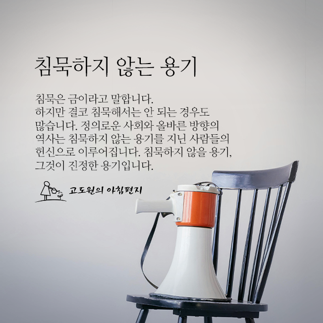 태그로 보는 아침편지 유튜브 명상 #다짐 #계획 #바이러스 #힐링 #아이들 비전캠프 독서캠프 #삶 #경험 #사람 #도움 #선택 희망 나눔 #친구 링컨학교 #극복 리더 위기 #독서 건강 면역력 침묵하지 않는 용기 꼭 사회적 논쟁의 한복판에서야 할 필요는 없습니다. 다만,자신의 신념을 지키기 위해 침묵하지 않는... #용기 #침묵 #방향 #사람 #진정 #역사 #사회 #정의 #헌신 #금 느낌한마디 15 좋아요 6 모으기 1 2026.1.16. 금요일 지금 행복하세요 쉬지 못하는 것은우리가 달리기를 멈추지않기 때문입니다. 우리는 오래전에... #행복 #사랑 #시간 #진정 #순간 #지금 #우리 #물 #계속 #확실 느낌한마디 21 좋아요 9 모으기 6 2025.10.30. 목요일 쉴 틈이 없다 아이들이 피곤하면날카로워진다는 사실은 쉽게 이해하면서어른도 마찬가지라는 사실은 왜 잘 이해하지... #에너지 #진정 #쉼 #사고 #집중 #숨 #허락 #계속 #상념 #잠시멈추게하는것 느낌한마디 27 좋아요 8 모으기 6 2025.10.1. 수요일 우연히 만난 맛있는 음식 해 질 무렵의호숫가를 걷는다. 저무는 것이저리 아름다운 줄은 미처 몰랐다.... #미소 #삶 #음식 #자연 #사람 #진정 #태도 #극과극 #아름다운세상 #무상 느낌한마디 22 좋아요 7 모으기 3 2025.8.5. 화요일 큰 뜻, 큰 꿈 세상을유익하게 하는 뜻을 품으면하늘이 도와 뜻이 이뤄지고 뜻을 품은... #꿈 #진정 #의미 #뜻 #재물 #재앙 #명예 #권력 #큰뜻 #큰꿈 느낌한마디 25 좋아요 9 모으기 4 2025.7.24. 목요일 나를 바라보는 또 다른 '나' 진정한 당신은풍경이 스쳐 지나가는 것을바라보는 승객입니다. 당신의 의식은... #바람 #진정 #나 #의식 #일 #분별 #강물 #풀 #주시자 #개입 느낌한마디 27 좋아요 9 모으기 4 2025.7.11. 금요일 바로 알아차릴 수 있는가 현실에서좋은 일이 생기더라도 관심을 두고살펴보지 않으면 알아차리지 못할 수도 있다.... #진정 #의미 #일 #일상 #잠재의식 #각인 #지나가는일 #깨어있는사람 느낌한마디 21 좋아요 9 모으기 5 2025.4.29. 화요일 '왜 하필 나야?' 몇 년이 지난 지금도여전히 엘리자베스를 기억한다.엘리자베스는 그토록 젊은 나이에 홀로... #감사 #영혼 #성숙 #삶 #사람 #진정 #불행 #모든것 #위대한영혼 #왜하필나야 느낌한마디 19 좋아요 9 모으기 8 2024.11.21. 목요일 타인의 존엄성 증오와혐오의 말과장벽이 넘치는 사회는... #위로 #공감 #진정 #한숨 #시선 #말 #존재 #필요 #존엄성 #혼 느낌한마디 20 좋아요 10 모으기 3 2024.9.12. 목요일 마음의 고요를 보석으로 만드는 길 고요, 우리가소유할 수 있는 가장 비싼 보석입니다.고요는 맑은 물과 같습니다. 깊은 곳이 잘 비칩니다.... #시간 #삶 #마음 #침묵 #고요 #진정 #훈련 #보석 #숨 #응시 느낌한마디 46 좋아요 8 모으기 9 2023.11.15. 수요일 75년 인생에서 얻은 것 영국의 저널리스트인 맬컴 머거리지는 "내가 이 세상에서 75년 인생을 살면서 배운 모든 것, 특히... #행복 #인생 #진정 #열매 #존재 #고통 #터널 #추구 #고양 #계몽 느낌한마디 20 좋아요 52 모으기 27 2020.9.25. 금요일 '다, 잘 될 거야' "다, 잘 될 거야." 이 말에, 진심으로 위로받아본 적이 있을까? 나는 그 말에 한 번도 안도해 본 적이 없는 것 같다는... #위로 #진심 #진정 #노력 #상처 #공허함 #안도 느낌한마디 19 좋아요 47 모으기 16 2020.9.24. 목요일 내려야 보입니다 별을 찾는 소년아너의 어리석은 등불을 꺼라이제 별이 환하다... #마음 #사람 #진정 #시선 #우주 #등불 #별빛 #주변 #은하수 #상대 느낌한마디 7 좋아요 42 모으기 24 2020.8.1. 토요일 진정한 휴식 스포츠 의학 전문가들은 진정한 휴식이란 아무것도 하지 않는 '무(無) 활동 상태'가 아니며, 그보다는 ... #휴식 #진정 #쉼 #休 느낌한마디 35 좋아요 257 모으기 0 2017.1.14. 토요일 당신을 위한 기도 오늘도 하나님께 기도했어.당신 사랑하니까, 당신이 겪고 있는그 모든 고통 다 내게 달라고...... #사랑 #기도 #진정 #불행 #당신 #간절한기도 느낌한마디 122 좋아요 0 모으기 0 2012.2.20. 월요일 인간성 진정으로 우수한 인재는인간성도 훌륭한 사람이다.재능은 있으나 인간성이 부족하면 ... #진정 #인재 #인간성 #실력 느낌한마디 148 좋아요 0 모으기 0 2012.2.13. 월요일 몸 따로 마음 따로 낮에는 난민촌을 돌아보고 밤이면 호텔로 돌아와 따뜻한 물로 샤워를 하고푹신한 침대에 누워 있는 내 자신이 그렇게도 싫고 ... #마음 #진심 #행동 #진정 느낌한마디 78 좋아요 1 모으기 0 2009.2.26. 목요일 내면의 어린아이 내면의 어린아이는 당신이 마음속 깊이 갈망하는 것들과 풍요로운 삶, 그리고 어린아이다운 신뢰를 ... #사랑 #성찰 #내면 #어린아이 #순수 #진정 #풍요 #어린시절 #드류 레더 #순진무구 느낌한마디 28 좋아요 0 모으기 0 2008.12.2. 화요일 "여보, 죽이 더 맛있어!" 저라고 매번 설교를 잘하는 것은 아닙니다.못할 때도 있습니다. 그러면 예배가 끝나고 ... #꿈너머꿈 #격려 #진정 #고도원 #장경동 #설교 #아주 특별한 행복 #특별한 사람 #후원자 느낌한마디 54 좋아요 0 모으기 0 2007.12.24. 월요일 세 번의 심호흡 꽉 막힌 도로에서 화가 치밀어 오른 적이 누구나 있을 것이다. 이럴 때 '세 번의 심호흡'을 통해 도움을 받을 수 있다. ... #진정 #심호흡 #삶의 길 #감사하는 마음 #토머스 크럼 #마음의 평안 느낌한마디 51 좋아요 0 