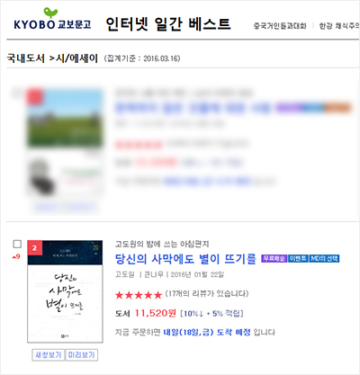 어제(2016년 3월16일) 교보문고 일간 베스트셀러 2위에