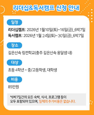 '링컨학교 리더십캠프(4기)' 신청하기'링컨학교 독서캠프(16기)' 신청하기'건강명상법 스테이' 신청하기북적북적 북스테이 '차(茶)테라피' 신청하기성공과 성장을 부르는 '내면혁명 워크숍'(4기) 신청하기