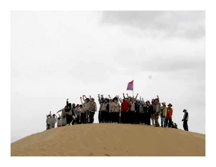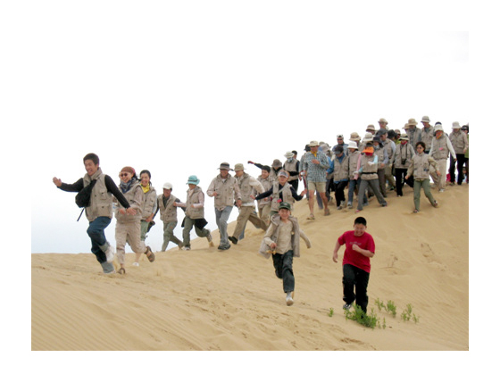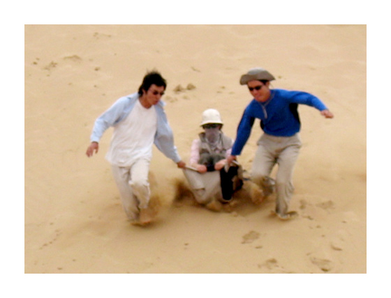 모래 썰매. 제법 가파른 모래 언덕에 오르자 장난기가 발동한 몇몇이 입고 있던 조끼를 벗어 즉석에서 썰매를 만들었다. |