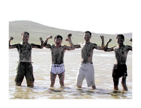 왠 몸짱 대회? 피부에 좋다는 차가노르(호수)의 진흙으로 머드팩을 하고 알통자랑을 하고 있다. |