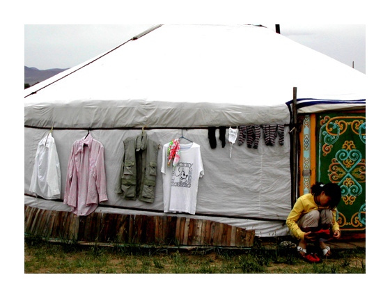 빨래 말리기. 몽골 날씨는 햇볕이 따갑고 바람이 많이 불어, 옷을 빨아 게르 밖에 널면 금방 마른다. |