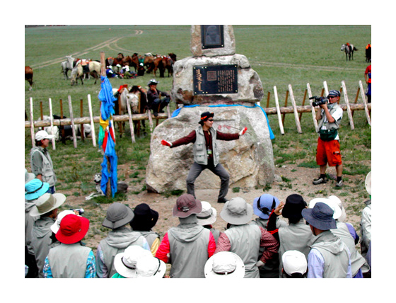 칭기스칸이 제국을 통일하고 즉위한 기념비 앞에서, 이번 여행 진행을 맡은 안석현님이 재미있는 몸짓으로 설명을 하고 있다. |