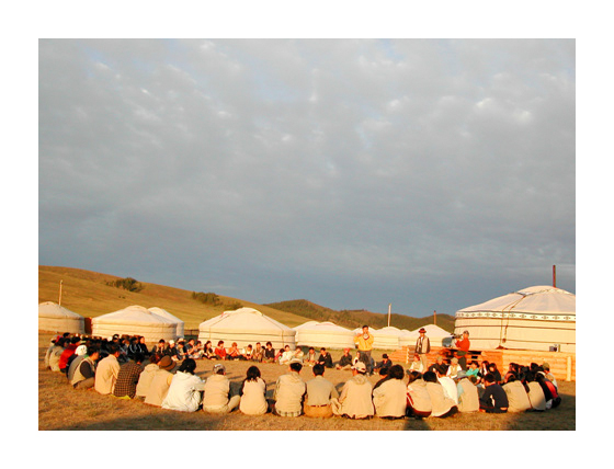 석양아래 둘러앉은 여행팀. 자기소개와 여행소감 등을 말하는 시간을 가짐으로써, |